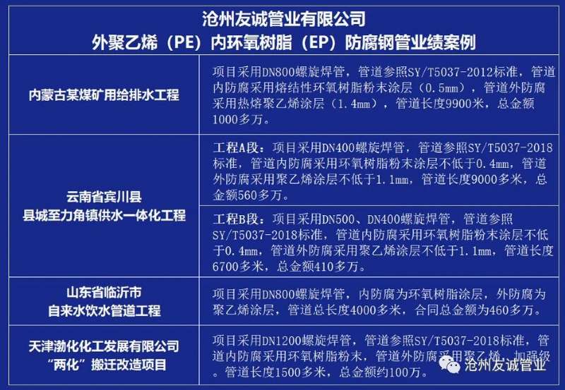 外聚乙烯內(nèi)環(huán)氧防腐鋼管,集合了聚乙烯和環(huán)氧樹脂的優(yōu)異防腐性能和抗沖擊耐磕碰性能于一身,可以耐酸、堿、鹽以及污水、土壤等環(huán)境侵蝕,適用于城市供排水管網(wǎng)、長(zhǎng)輸管線輸送自來水、污水、中水和海水的管道工程。外聚乙烯內(nèi)環(huán)氧防腐方案已經(jīng)被市場(chǎng)證明是管道防腐的最佳防腐組合方案。
