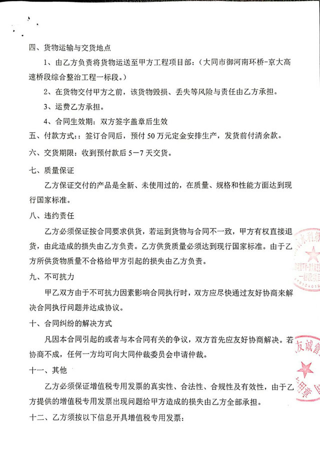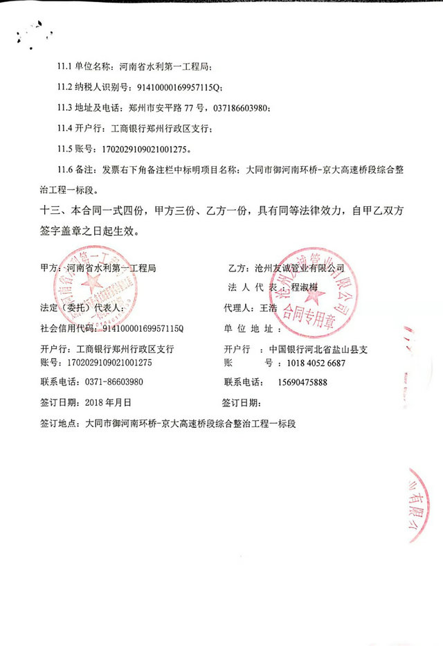 2018年我公司與河南省水利第一工程局合作,簽署大同市御河南環(huán)水利項(xiàng)目外PE內(nèi)EP防腐鋼管采購合同,此工程管道尺寸為DN1200和DN600兩個(gè)規(guī)格,其鋼管防腐采用了最新型防腐形式-外PE內(nèi)EP防腐鋼管,防腐蝕強(qiáng)度高,作為地埋鋼管耐酸耐堿強(qiáng)度強(qiáng)度強(qiáng),能夠順利合作感謝客戶對(duì)我們的信任,采購合同如下: